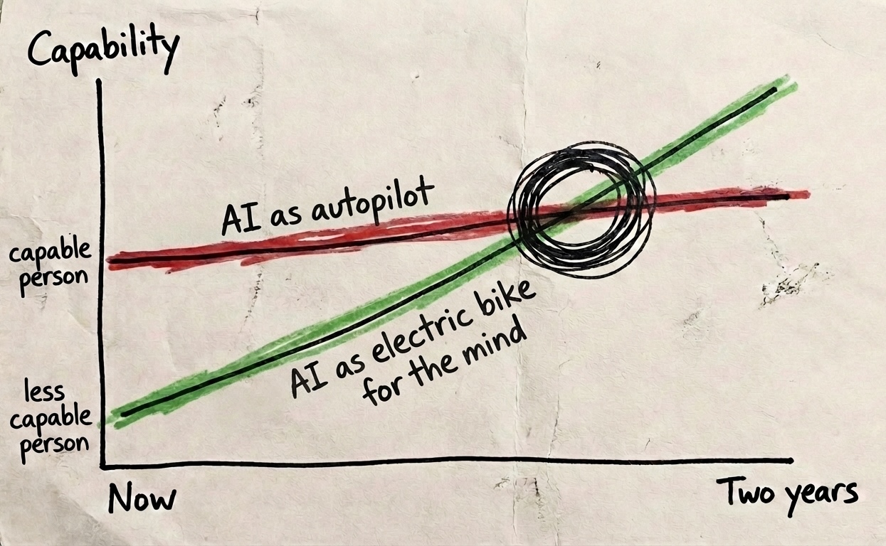 A reader challenged the graph directly, arguing it understates the amplification effect for already-capable people. The determining factor: what they called the "explorer mindset" (intellectual curiosity, creativity, constant learning), which "cannot be taught. It is self-discovery." The fear for their own organisation: "we run the risk of becoming the new average."
